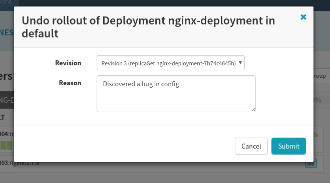 In cases where you see something is immediately wrong and isolated to a resource in the “Clusters” tab, you can select “Undo Rollout” from the “Actions” dropdown: