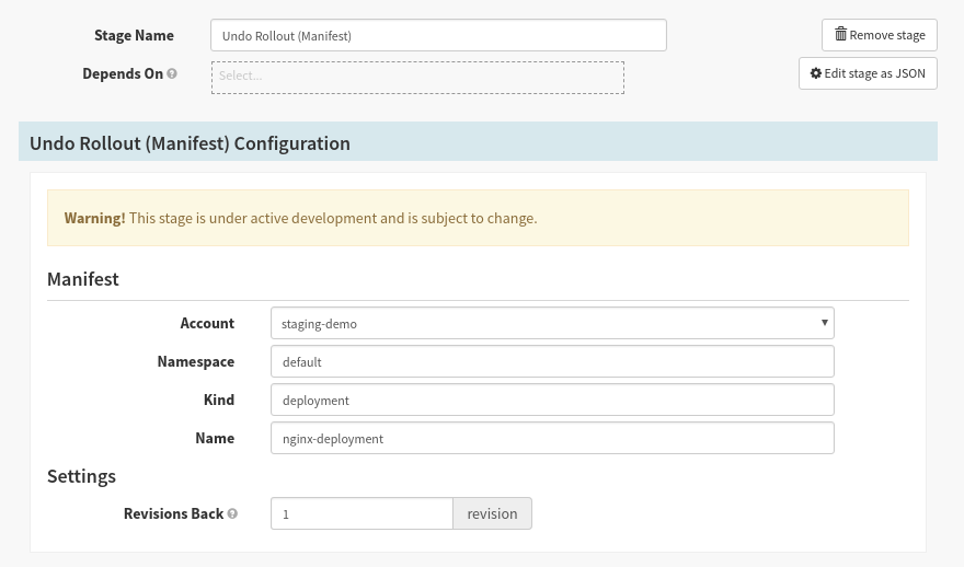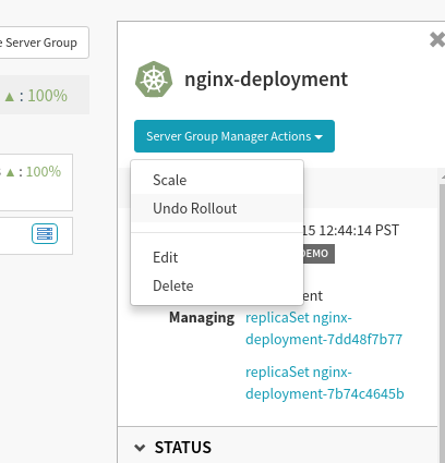 Spinnaker exposes “Undo Rollout” functionality in two places, in the Clusters tab , and as a pipeline stage .
