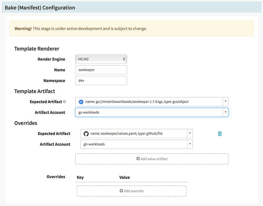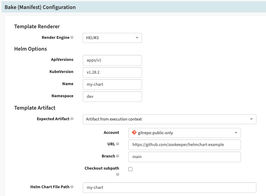 data: apiVersions: {{ .Capabilities.ApiVersions }} kubeVersion: {{ .Capabilities.KubeVersion }}In this example, you have a fully configured Bake (Manifest) stage, including the ApiVersions and KubeVersion fields: