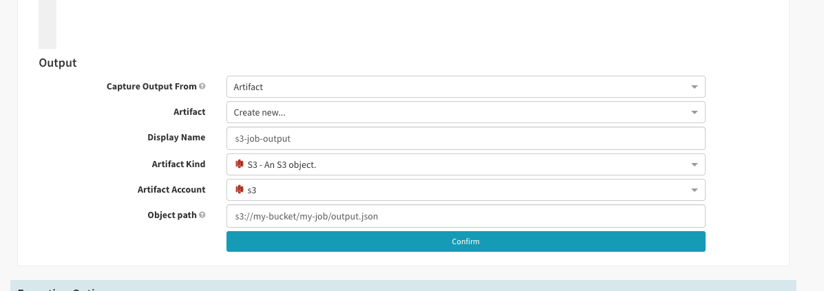 In order to use artifacts to capture output data, your job needs to push output to one of Spinnaker’s supported artifact stores . This output is captured at the end of the job execution and injected into the pipeline for use in downstream stages via SpEL. Artifacts captured as output must be in JSON format.