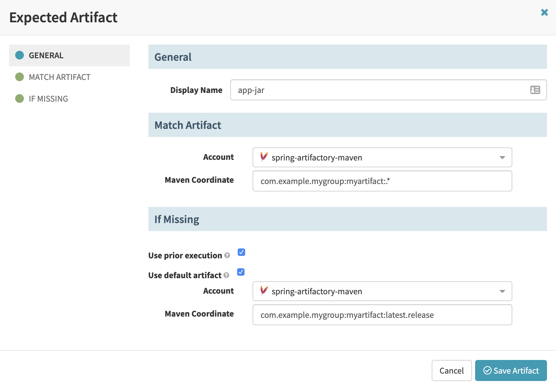 b. In the Artifact Constraints dropdown for the Artifactory trigger, select “Define a new artifact…” and populate the Expected Artifact form with the details of the artifact that will be published to the Artifactory repository.