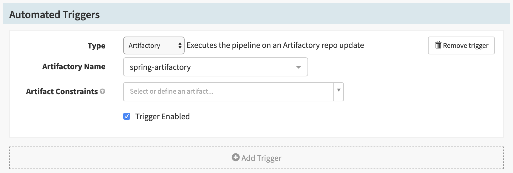 a. Create a new pipeline for your application. In the pipeline configuration, add an Artifactory trigger to the Automated Triggers, as shown below.