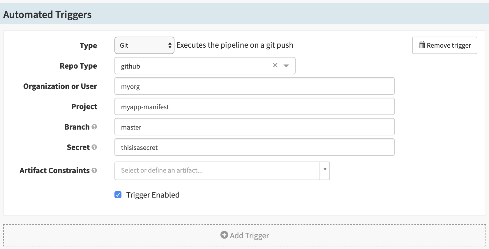 c. Add a Git trigger to the Automated Triggers, as shown below. Supply the secret you used in Step 4a.