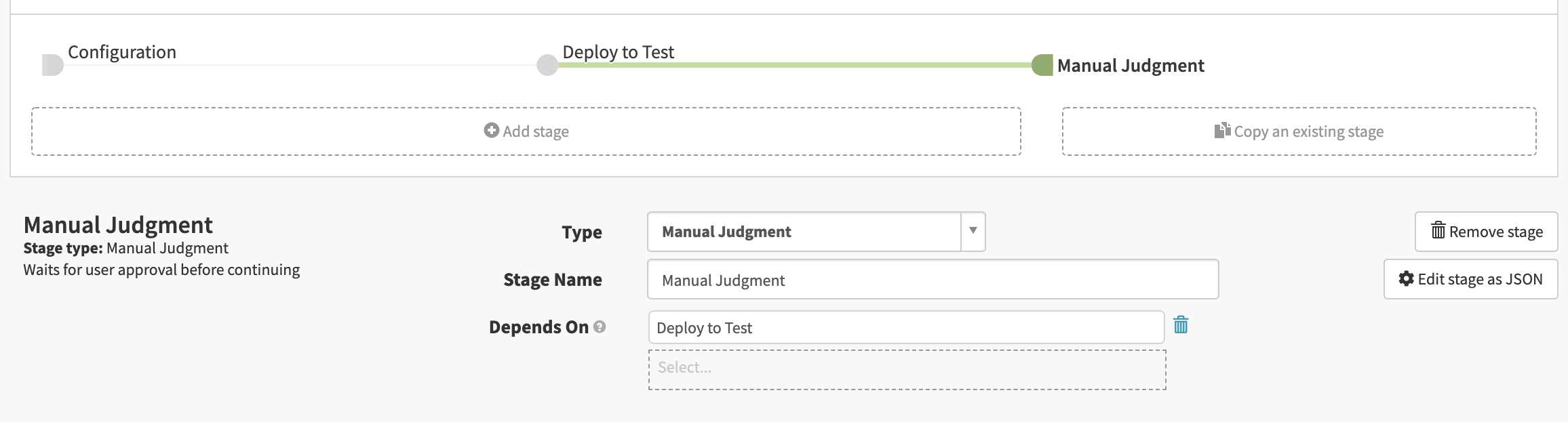 g. Add a “Manual Judgment” stage. You can use this stage, or stages such as “Script” or “Canary Analysis”, to verify a deployment before promoting it from the test environment.