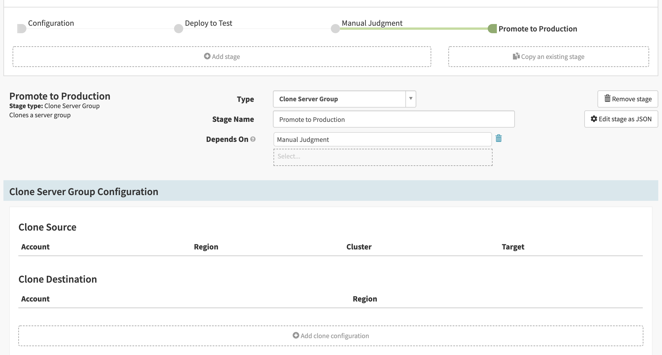 h. Add a “Clone Server Group” stage to the pipeline. This stage promotes the deployed application to the production environment.