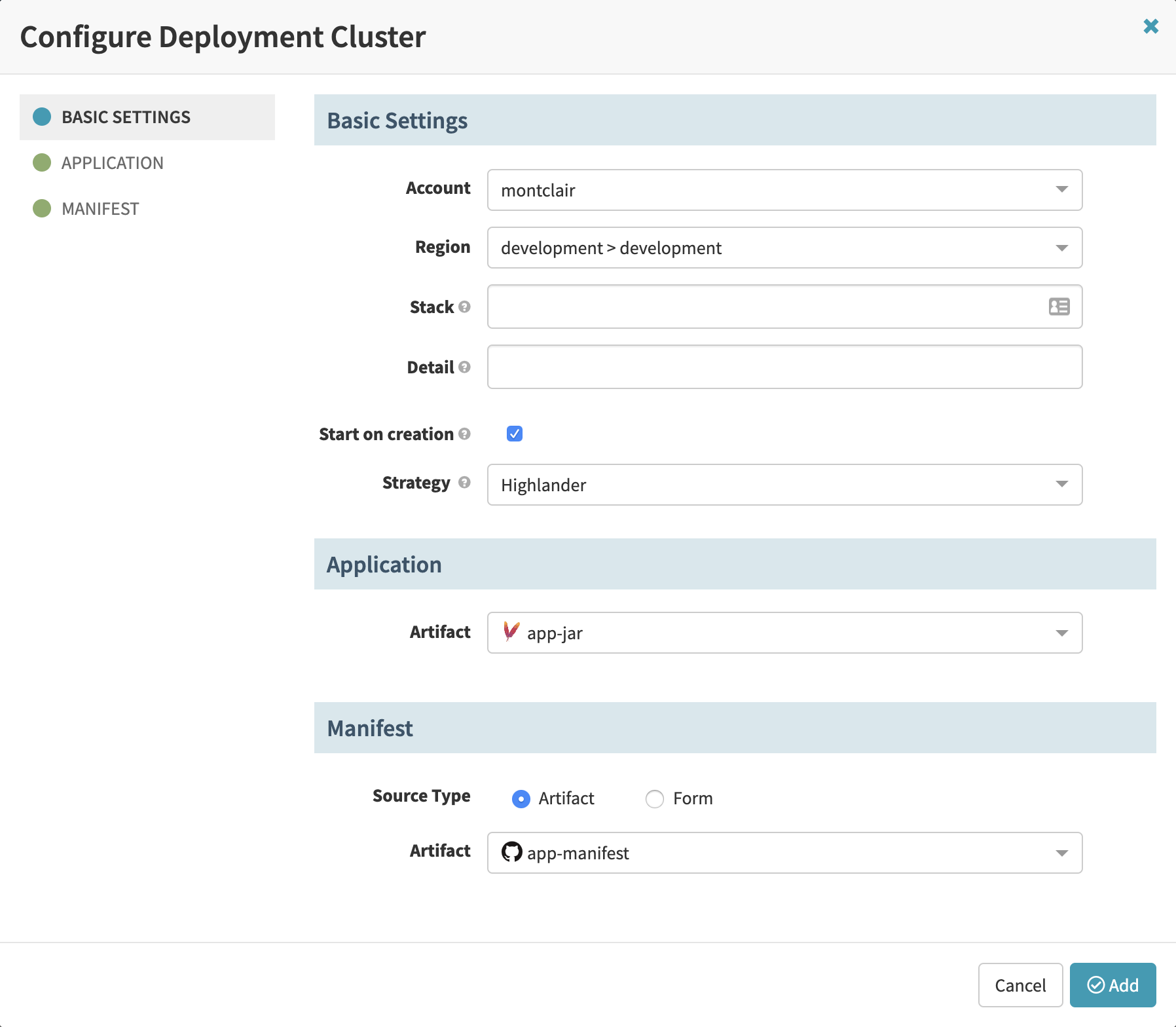 f. Add a new server group and provide details on deployment settings, the application artifact, and the manifest artifact: