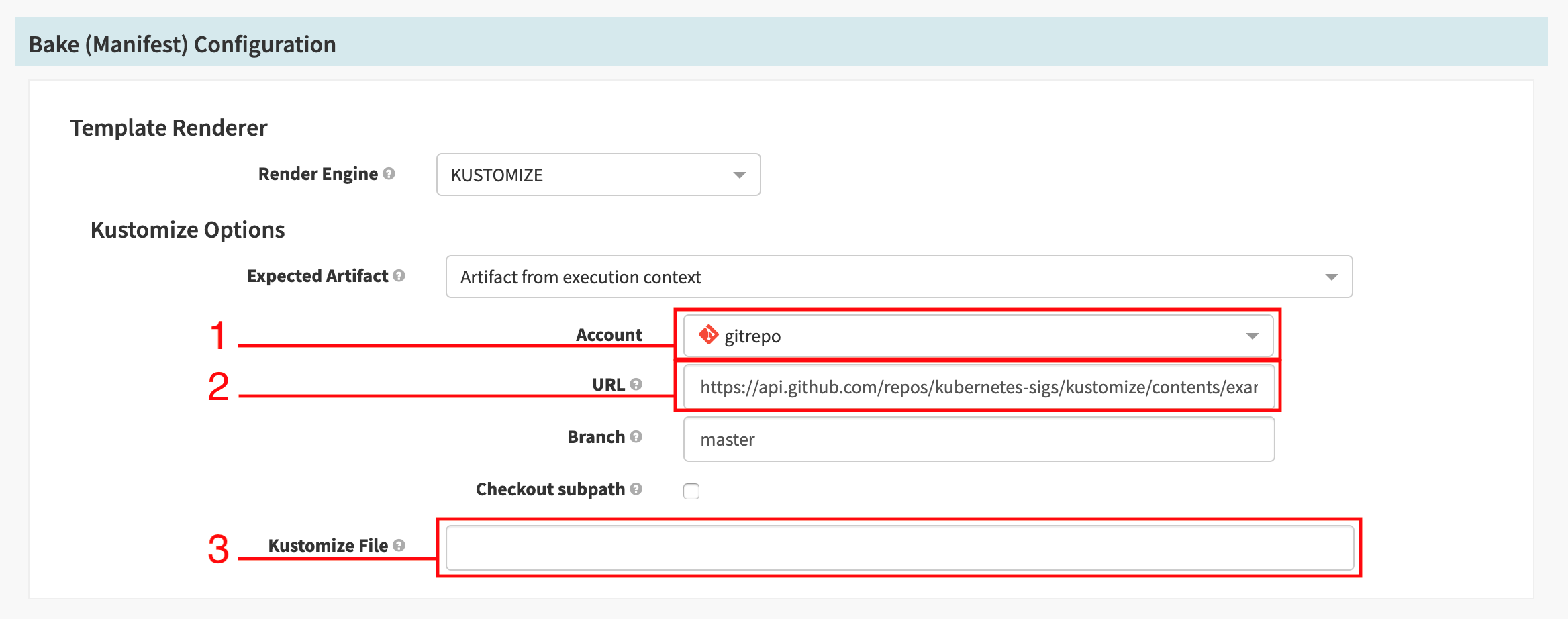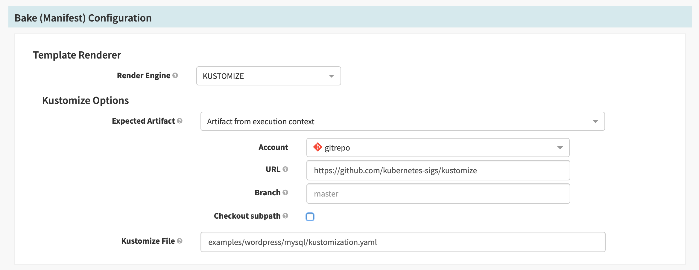 Pipelines configured to use Kustomize in 1.16 will continue to work in 1.17. However, editing a Bake (Manifest) stage in 1.17, which was originally created in 1.16, requires you to update the Bake (Manifest) Configuration to use the git/repo artifact type. To do so, use the following instructions: