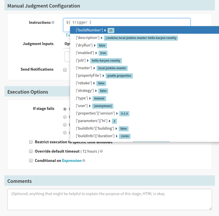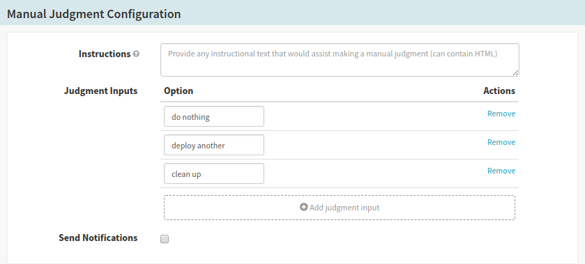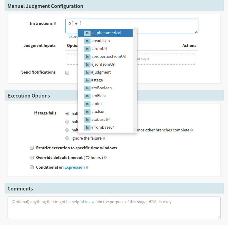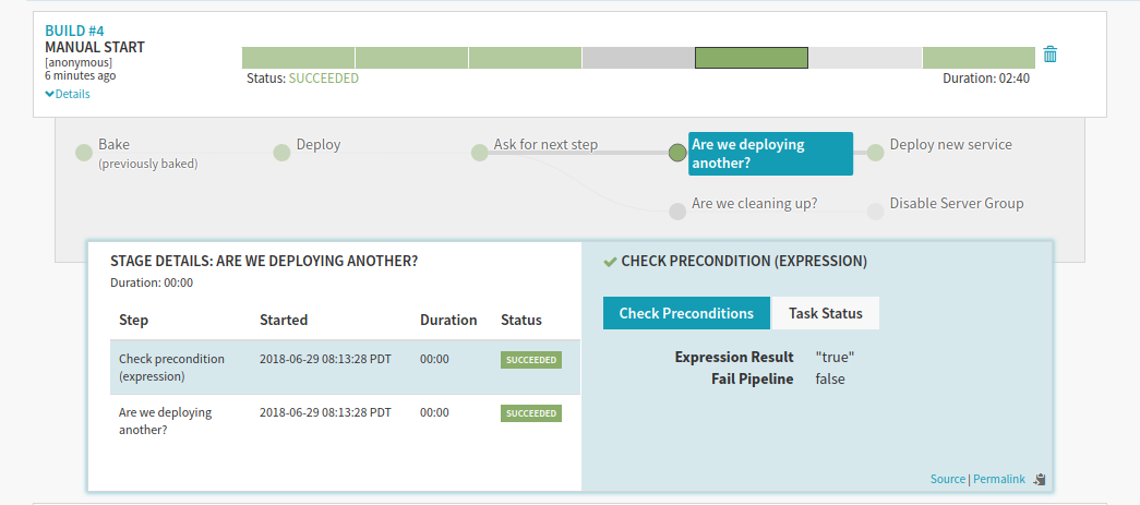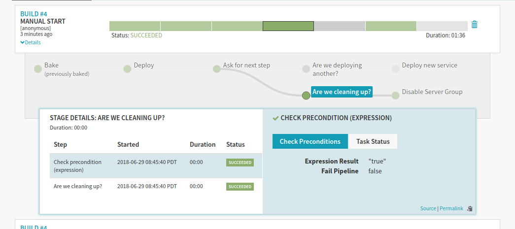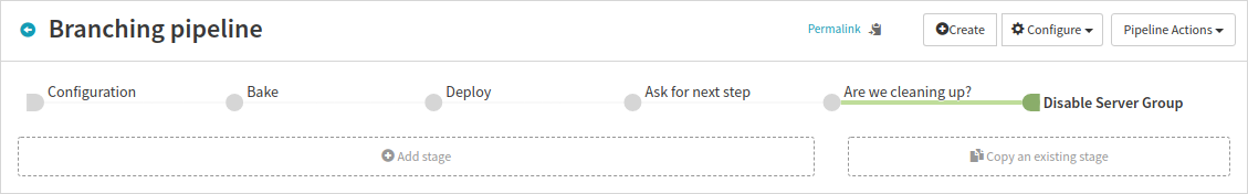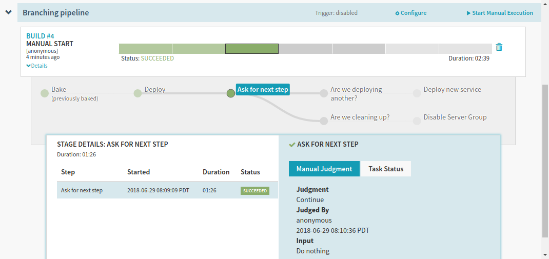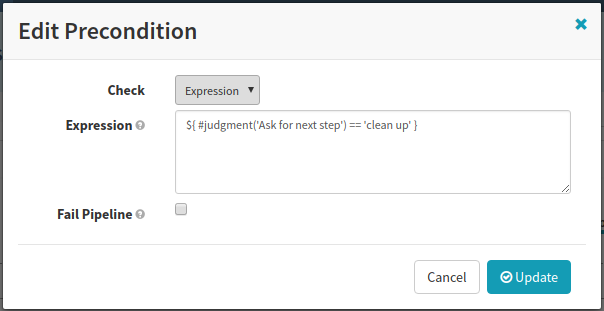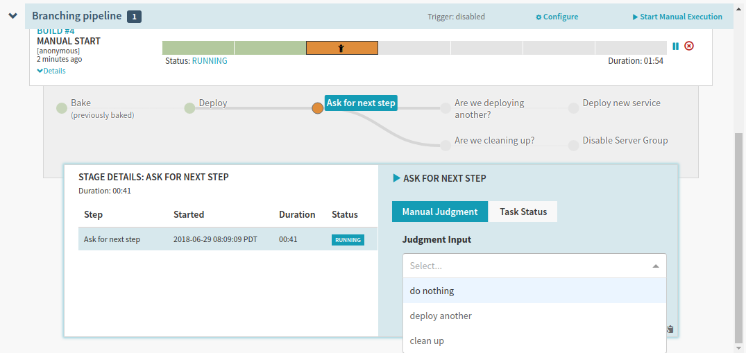 judgmentfunction checks the output of a Manual Judgment stage whose name matches the input string. Note that the input is case-sensitive. Since the name of the Manual Judgment stage is ‘Ask for next step’, attempting to find it using#judgment("ask for next step")would fail.Now you have a branch of your pipeline that only executes if you decide to clean up. Add any stages you want to execute based on this precondition. For example, you may want to add a stage that disables the oldest Server Group.