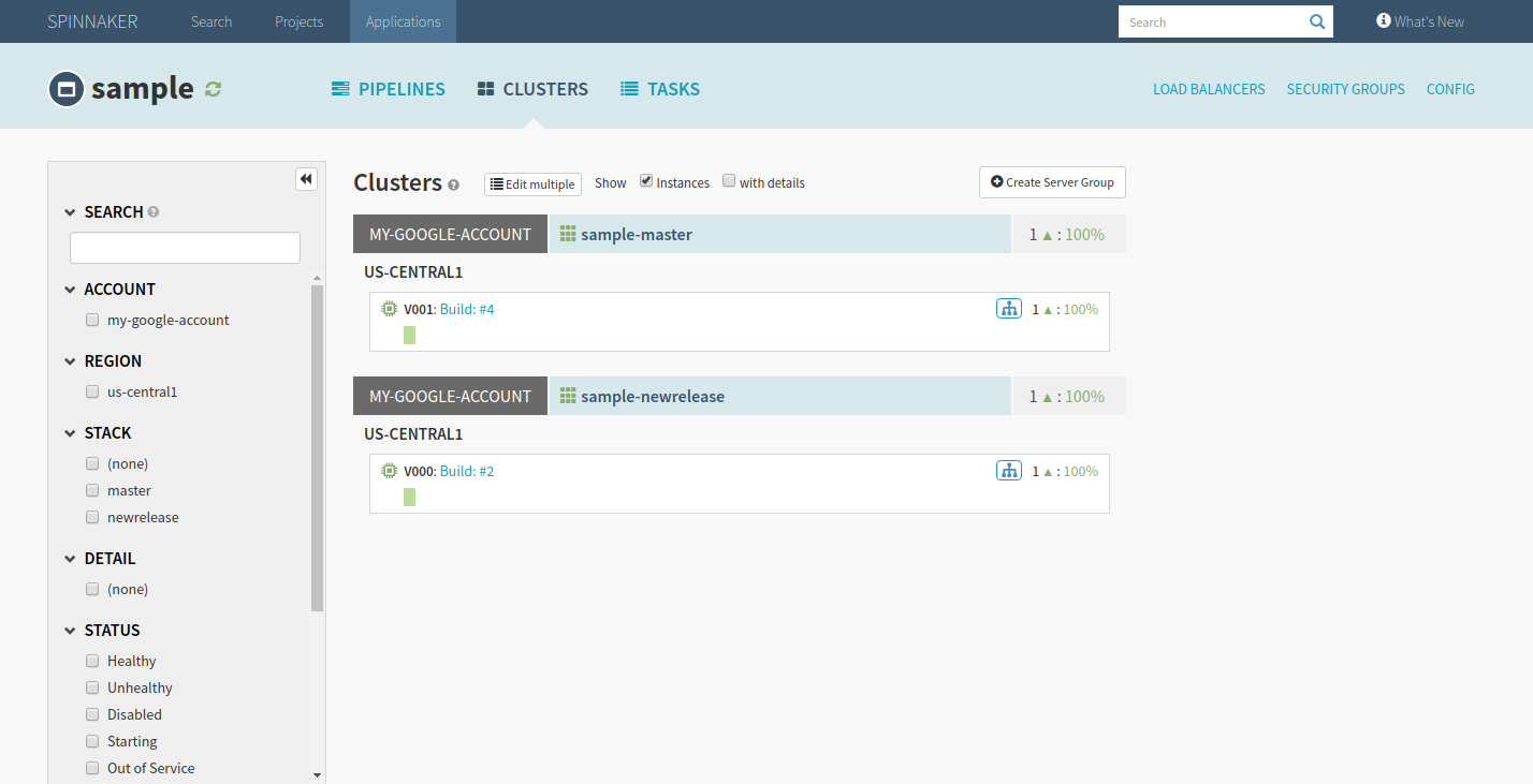 Commit to a git branch in the repo you’ve connected to Jenkins in order to trigger your pipeline. When the pipeline runs, it replaces the expression with the name of the branch, creating a new cluster. The screenshot below shows what happens when you push commits to both the master branch and a branch called new-release. Note that the dash was stripped out of new-release, creating the newrelease cluster.