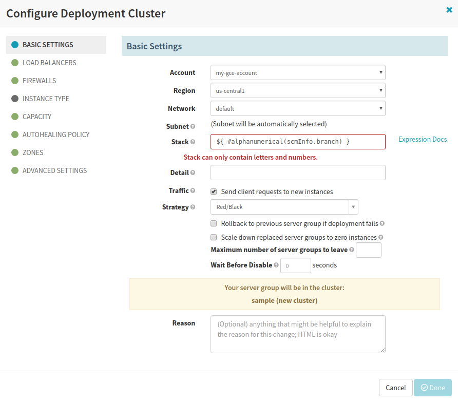 ${#alphanumerical(scmInfo.branch)}rather than a static value.#alphanumericalstrips out all special characters from the input string, which is important because some providers don’t allow stack names with special characters.scmInfois a helper property which provides details about the most recently executed Jenkins job.