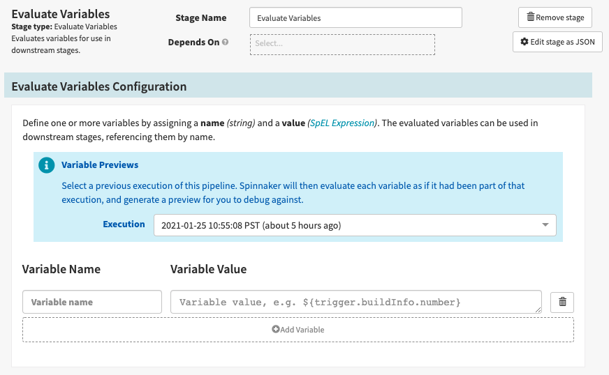 As shown in Option 2, Spinnaker makes any variable set with an Evaluate Variable stage accessible to pipeline expressions during runtime through an Ephemeral Variable that is referenced by its defined name. This simplifies the process of referencing the variable downstream and eliminates the need to write out the long form shown in Option 1 above. Be careful to inadvertently overwrite the variable in subsequent Evaluate Variable stages in the pipeline.