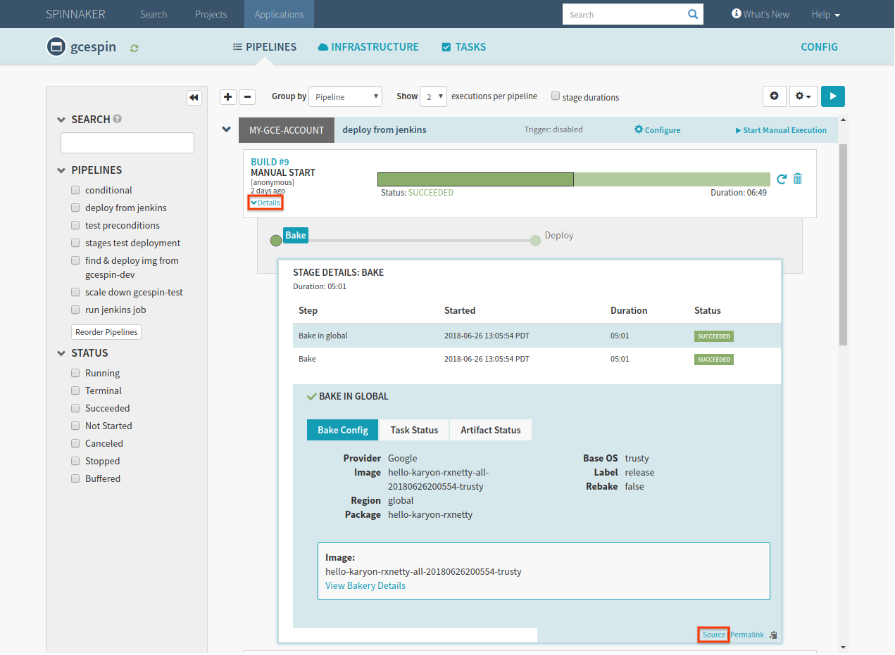 You’re going to set up a pipeline with three conditions, and gate these conditions with a manual judgment stage. The screenshots below show a pipeline that receives and bakes a binary from a Jenkins trigger, but you can work through this example with any pipeline that’s able to deploy an image.