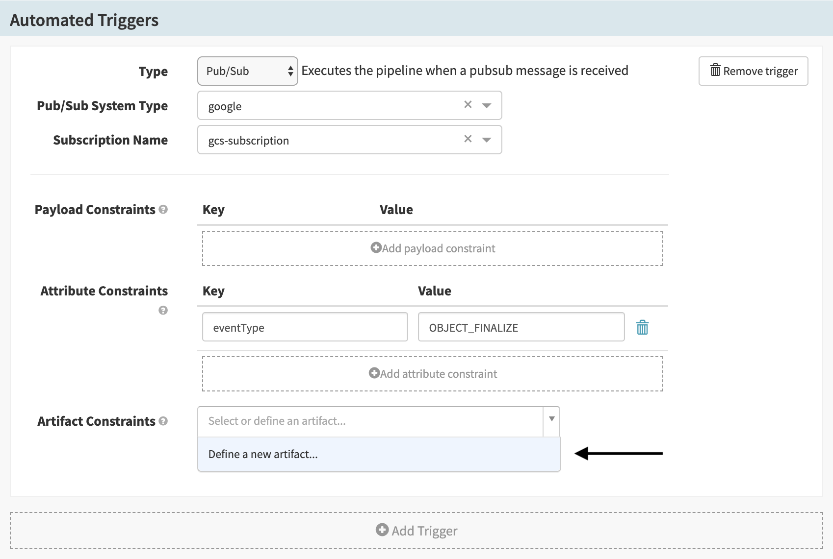 To configure the artifact, go to the Artifact Constraints dropdown for the Pub/Sub trigger configuration, and select “Define a new artifact…" to bring up the Expected Artifact form.