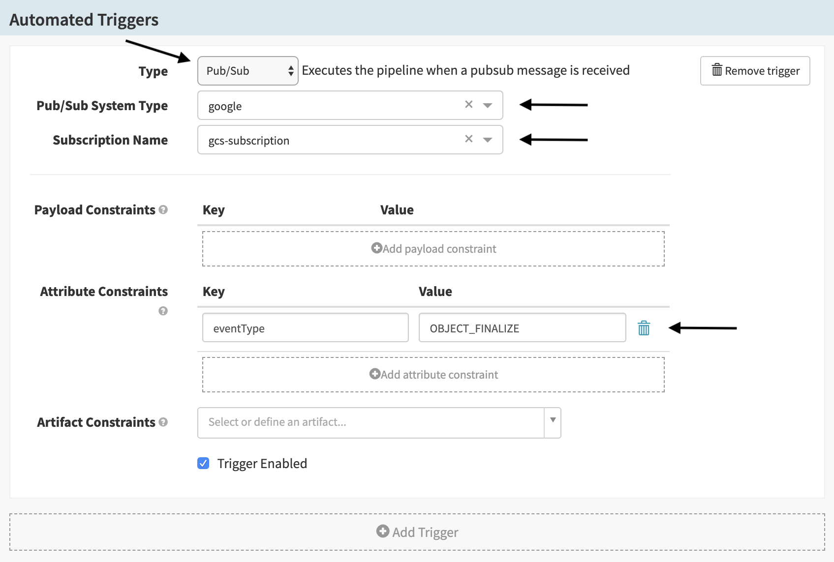 Now we need to declare that the Pub/Sub trigger expects that a specific artifact matching some criteria is available before the pipeline starts executing. In doing so, you guarantee that an artifact matching your description is present in the pipeline’s execution context. If no artifact for this description is present, the pipeline won’t start.