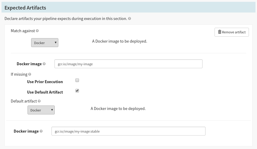 If you are running a stage that does not natively emit artifacts (such as the “Run Job” stage), you can use the default artifact, which always binds to the expected artifact, to be injected into the pipeline each time it is run. Keep in mind: If the matching artifact is empty, it will bind any artifact, and your default artifact will not be used.