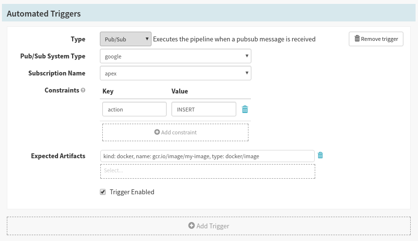A pubsub subscription configured to listen to changes in one GCR registry. Since this registry can contain many repositories, we’ve assigned it an expected artifact to ensure only changes in one repository can run this pipeline.